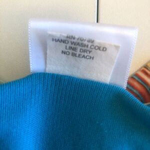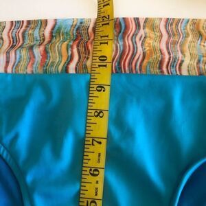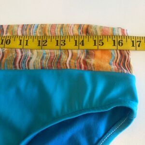 Hit the beach or pool in this pretty, sexy swimsuit. The bottoms are a large and the top is 1X. The top lining has two runs in one cup, and one in the other. See photos. Will not affect wear. Otherwise in excellent condition. This item has been laundered.