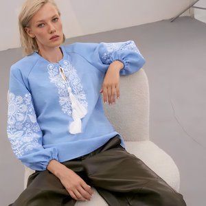Based on traditional Ukrainian clothes, this modern long sleeve embroidered ethnic blouse will perfectly match skirts or pants, including jeans. The top is straight. The hemline is long enough to be tucked into the top of your pants, if desired, or can be worn outside in a figure-elongating, flattering style.
