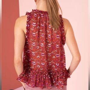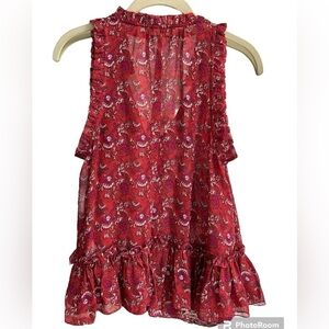 Beautiful patterned blouse with ties in the front. Can be left open as shown in the pictures. Ruffle accents on bottom and sleeves. Floral design throughout. Excellent condition, no flaws.