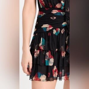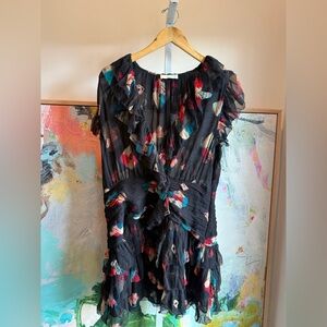 Ulla Johnson's best-selling Zina dress is reimagined in fluid chiffon patterned with graphic motifs created using a traditional Japanese shibori dyeing technique. The flutter sleeves and ruffled detailing lends a romantic feel.