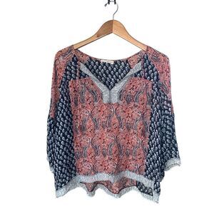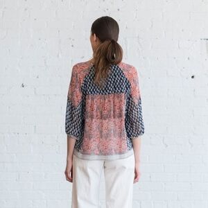 This airy peasant blouse has beautiful detailing: Indian paisley print with hand-tied rosette tassels and gold threading. Color: Coral split neckline with thin ties 3/4 sleeves with hand-stitched elasticated wrist alternating patchwork hand-tied rosette tassels gold threading soft gathers at back yoke.