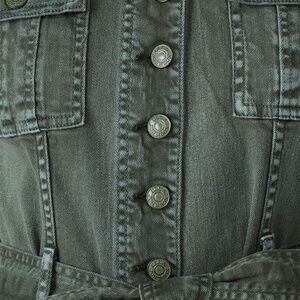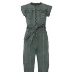 Green denim 99% Cotton, 1% Elastane). Jumpsuit. Cap sleeves. Crew neckline. Exposed front button closure.