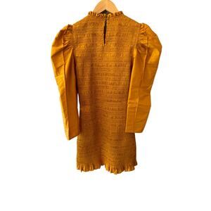 Ulla Johnson Aurele Dress Shirred Taffeta Mini Dress in Mustard Yellow. Size US 6 / Medium. Features a figure-hugging fit, long sleeve and mock neck, ruffle and keyhole accents, puffy gathered sleeves, and back button closure. Fabric: 78% Polyester, 22% Silk. Excellent pre-owned condition. MSRP $595.