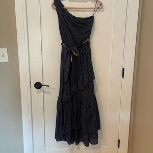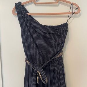 Chic one-shoulder dress with elegant stripes. Features a stylish belt and tiered skirt. Perfect for any occasion.