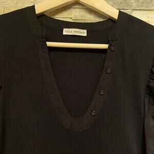 A striking and feminine silhouette by cult-favorite designer Ulla Johnson. This rare Amiri piece in Noir features a fitted ribbed knit bodice with a deep scoop neckline trimmed in a half-button placket, dramatic puff shoulders, and a tiered woven cotton skirt. A perfect blend of structure and softness — romantic with an edge.