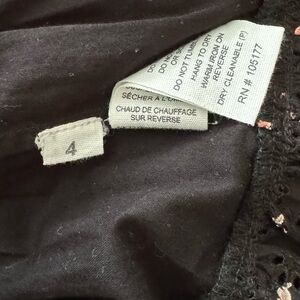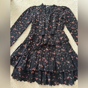 Beautiful black mini dress from Ulla Johnson. Longsleeve with v neckline and optional tie tassels. Red florals throughout and eyelet lace. Tiered Ruffle skirt. Great quality and condition