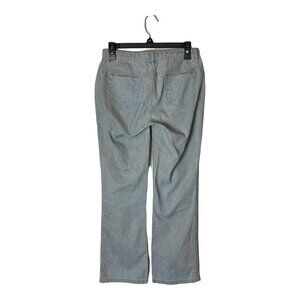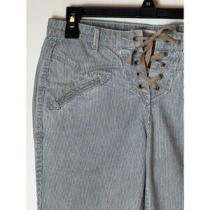 These pants by Ulla Johnson are in excellent condition. They are blue and white striped and have a lace-up closure in the front. They have belt loops and two jetted pockets on the front. They have two patch pockets on the back and are cropped in length. They are made of 100% cotton. There is no size tag so please refer to measurements for sizing.