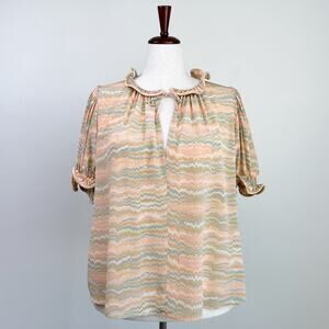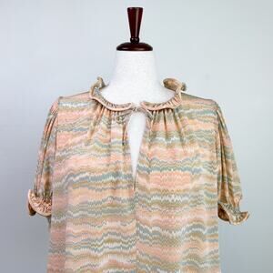 Size 16 Ulla Johnson Corine Blouse in Opal. 100% silk fabric in a beautiful print. V-Notch neckline with ties. Ruffle detail at neck and sleeves. Lightweight and flowy. Great condition!
