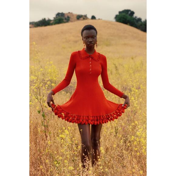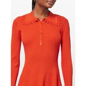 New with tags Ulla Johnson Cybil Tulip-Edge Rib Knit Mini Dress in Carnelian. This sculpting rib-knit dress offers a flattering, body-skimming fit with signature tulip-edge detailing that adds soft, feminine movement. Crafted from a viscose-blend knit with comfortable stretch, it features long sleeves, a spread collar, and a refined silhouette that transitions effortlessly from day to night. The vibrant Carnelian hue is rich and warm, perfect for fall and winter dressing.