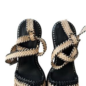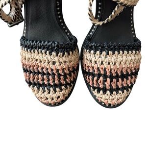 Beautifully crafted woven high heels from Ulla Johnson, style PS221000 in the Cameo colorway. Featuring a mix of blush, natural, and black braided raffia with wrap-around ankle straps and a sturdy block heel. Perfect for summer events, vacations, or elevating everyday outfits.