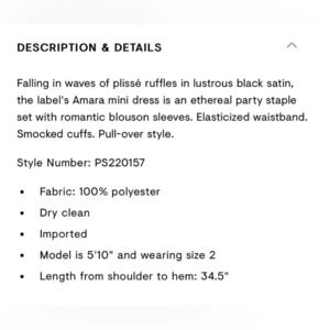 Features plunging neck-line, double-pleated ruffles throughout, elastic waist, hidden side zipper. Dress is 100% polyester with a satin feel. As seen on Kelly Clarkson