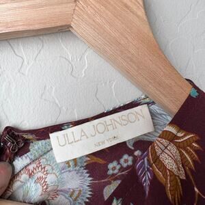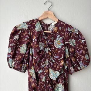 Ulla Johnson Helen Dress in Heliotrope floral print. This body-skimming midi dress features short puff sleeves, ruched bodice, and a delicate ruffle trim that trails asymmetrically across the front. It is finished with a handkerchief hem for beautiful movement and a hidden center-back zipper. Deep dark, almost burgundy red with multicolor floral details. Size 0.