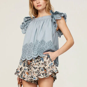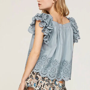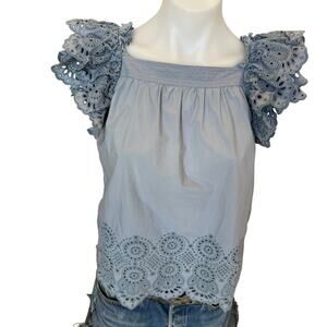 Ulla Johnson Dusty Blue Babydoll Top SIZE 4 Cottagecore Cotton Ruffle Eyelet $370