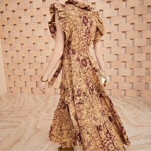 This exquisite Ulla Johnson dress in tan features a one-shoulder neckline and a tiered, ruffled design, perfect for a wedding guest or cocktail event. The dress is embellished with intricate floral appliqués and embroidery, adding a touch of elegance and sophistication. Its short sleeves and sundress style make it a standout piece for any special occasion.