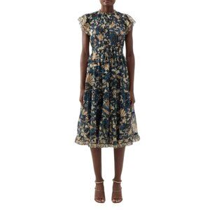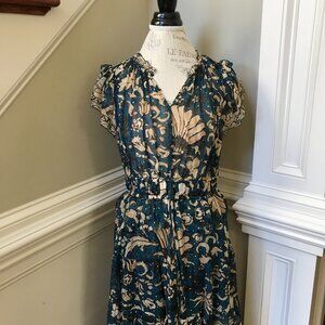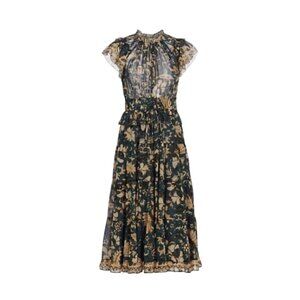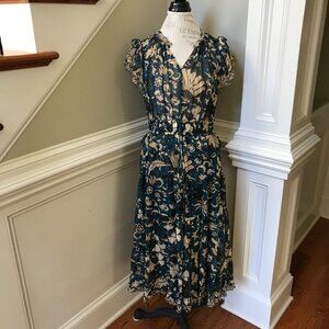 Ulla Johnson Emine Midi Dress Womens 10 Green Tan Silk Chiffon Floral Moonlight