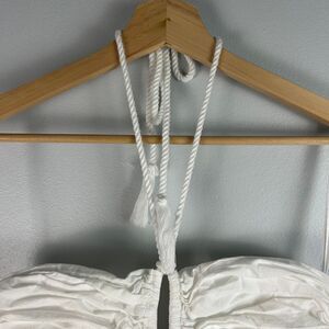 Ulla Johnson dress, designed for a figure-hugging fit to the hips and finished with a relaxed skirt. Teardrop cutouts add emphasis to the ruched bodice and halter neckline. To complete your outfit, opt for an understated pair of sandals.