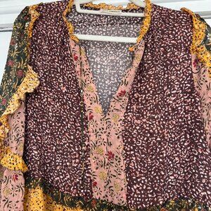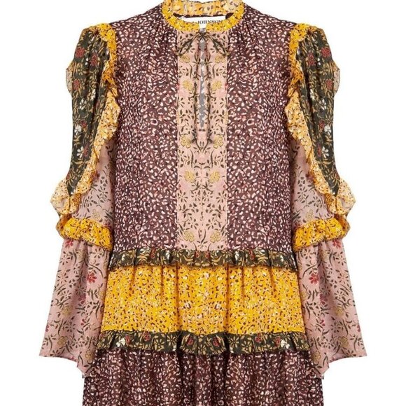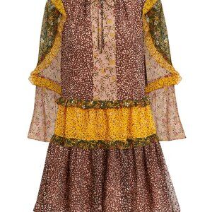 Ulla Johnson's Essie silk crepe dress in a yellow pastoral floral print. Ruffled split neck with self-tie closure. Three-quarter sleeves with ruffle trim. Very good condition.