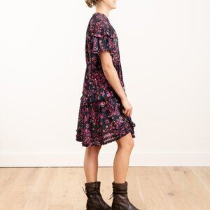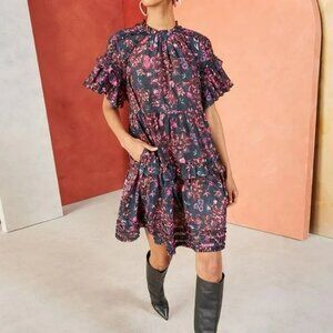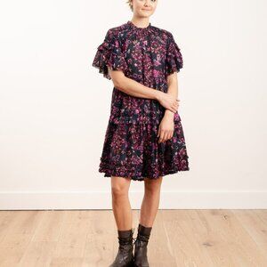 The Fawn Dress is crafted from a season-favorite floral printed cotton blend in a rich combination of deep midnight and bold purples. Classic full-volume mini dress silhouette featuring tiered skirt, layered sleeves, and delicate ruffle detailing. Made to have a voluminous fit.