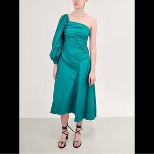 Ulla Johnson Fiorella midi dress in teal blue green size 4. Side zip one shoulder puff sleeve. Excellent preowned condition.