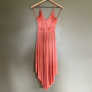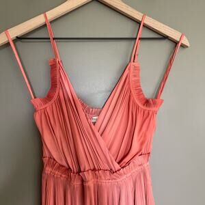 Ulla Johnson Galina Dress in Dahlia, Size 2, Coral Pink, Plisse Satin, Sleeveless, Spaghetti Straps, Surplice Neckline, V-Neck, A-Line Silhouette, Define Waist, Ruffle Detail, Flowy Material, Midi Length, In like new condition with no flaws or signs of wear.