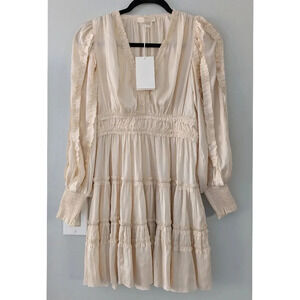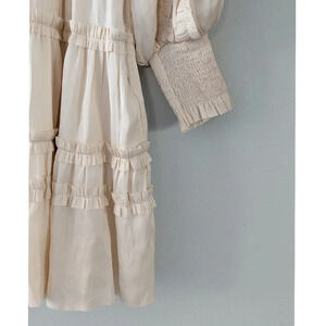 The Gemma Dress arrives in our signature plisse satin this season, adorned with double-edged ruffles throughout. This frock features a plunging neckline, voluminous sleeves finished with smocked cuffs, elastic waistband, and side seam zipper.