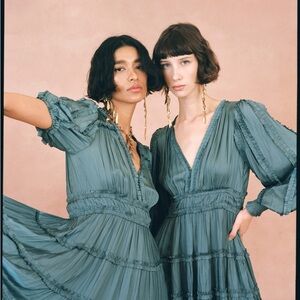 This stunning green mini dress by Ulla Johnson features a tiered, ruffled design perfect for a cocktail night out. The dress boasts a flattering v-neckline and elegant 3/4 bishop sleeves, adding a touch of sophistication to its sundress style.