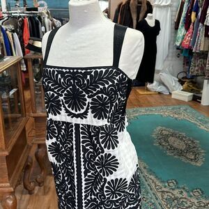 This amazing dress is absolutely stunning! The detail of the handmade work put into this dress is fabulous. The ivory fabric has a very light checkerboard pattern and the black stitching looks so vibrant against the fabric. It zips up the side and has an amazing fit. So rich and classy looking. Perfect condition…like new!