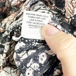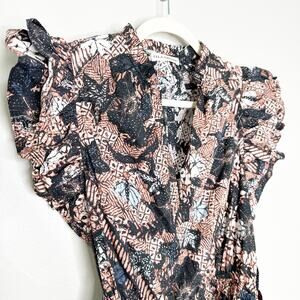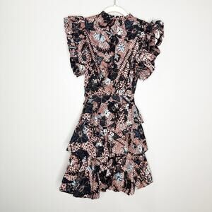 Style Notes: black and bronze abstract print, ruffle sleeve and skirt, mini length