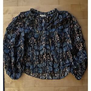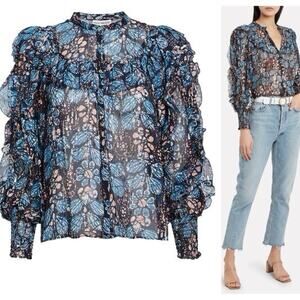 Ulla Johnson Isadora Sill Lurex Indigo Blue Sheer Floral Ruffle Blouse Size 0
