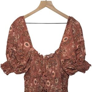 This mini dress has elegant puff sleeves that are finished with elastic cuffs and is shirred through the bodice and topped with delicate ties. The skirt is lined and finished with a gathered hem ruffle.