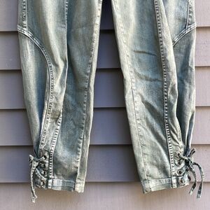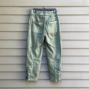 Our brand favorite Storm Jean has been reimagined for this Spring season as the Kingston Jean featuring feminine new adornments and crafted in our lovely hand painted acid wash denim fabrication. Peg Leg style featuring corset self-tie cuff, fold over waist band, and exposed button fly.