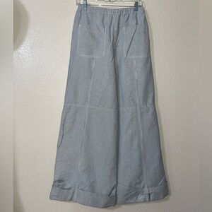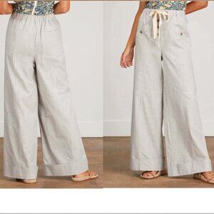 Kirkley Pants in the "Granite" color. These are made from a mid-weight cotton stripe fabrication, designed with oversized wide-legs that finish with a cuff. This relaxed silhouette has an elastic highwaist, and adorned with a grosgrain tie and "wooden" look buttons. These pants have front and back pockets.
