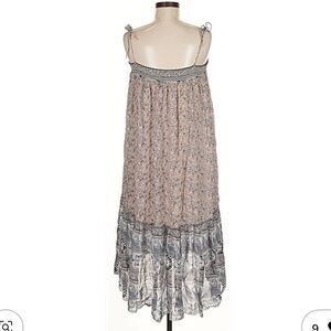 This is the coveted 100% silk Leilani dress from Ulla Johnson, seen on Tracee Ellis Ross (“Rainbow”) on Black-ish. It features a soft rose and grey paisley print, straight neckline with adjustable tie straps, and a relaxed, flowy silhouette with a tiered high-low hem and contrast border print.