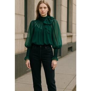 Ulla Johnson Lesli Silk Chiffon Blouse Women's Sz 6 Green Sheer Puff Sleeve Bow