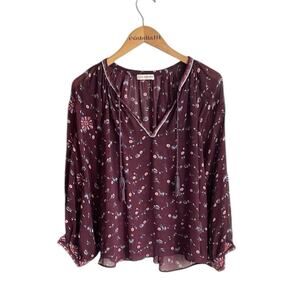 Details: Split neck with hand-made tassels, peasant sleeve with embroidered cuff, semi-sheer, unlined