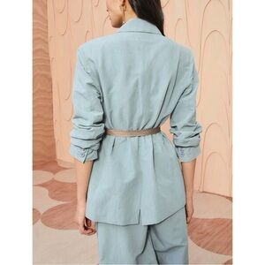 The Ellery Jacket is crafted from our luxurious slub suiting made from a cotton, linen, and silk blend. This jacket in a delightful slate-blue is designed with a slim sleeve and has a contrast ribbon belt that creates a cinched waist.