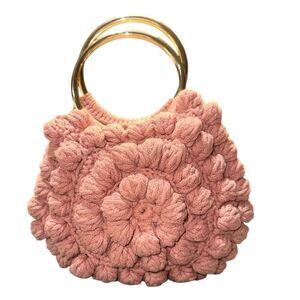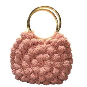 This unique statement bag will make you the fashion focus of any event. It’s durable and well made for every day use. High quality knot crochet in a textured warm dusty blush pink shade. The design features intricate, puffed detailing that creates a beautiful pattern. Sturdy gold-tone metal handles add a touch of sophistication and make it easy to carry. Perfect as a statement piece for casual outings or special occasions, this bag combines artistry with functionality.