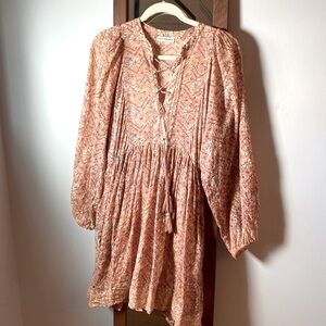 Elegant long sleeve dress by Ulla Johnson. Features a lace-up neckline and gathered waist. Perfect for any occasion.