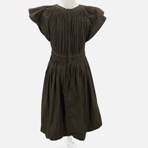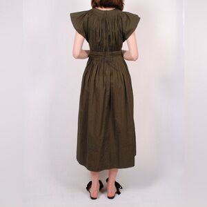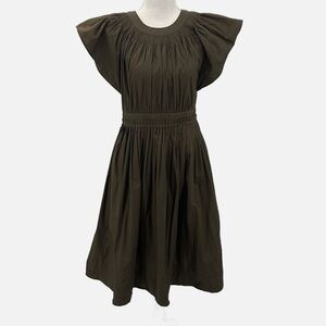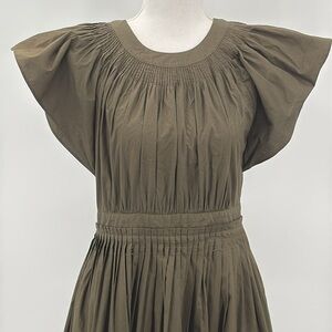 Ulla Johnson Lottie Hand Pleated Cotton Dress in Army - See Measurements. Good pre-owned condition. Pleating needs to be re-strung and secured on the back right by the zipper, shown in pic. Pretty sure the hem has been altered. I think this is why there is no care and size tag. They may still be attached under the new hem. It still falls below my knees and I'm 5'5". I'm sure the new hem could be taken out if you choose to do that. It's such a beautiful dress and needs to be worn. I've included the Ulla Johnson size conversion chart in the pictures. In my opinion, this dress is closer to a size 4. Please refer to measurements provided to ensure fit for you. Also, keep in mind that the dress is 100% cotton and has not stretch.