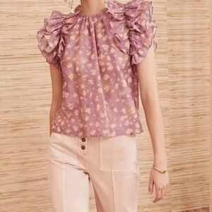Brand new without tags Ulla Johnson's Manon lavender and soft blush top with layered ruffled sleeves and center back button closure. The light and airy blouse is made from 79% cotton and 21% silk. Price is firm. Thank you.