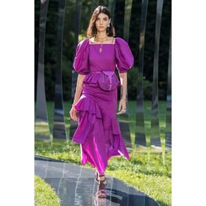 runway, high fashion, special occasion, holiday, wedding guest, party, date night, spring, summer, vacation, resortwear, net-a-porter, garmentory, intermix, luxury, purple, magenta, maxi dress, midi dress, asymmetrical, ruffles, puff sleeves, boho, bohemian, cottagecore, fitted