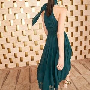 The Maya Dress is cut from 100% silk chiffon in a deep green hue of Everglade. This elegant silhouette features a ruched pintuck technique at the waist, halter neckline adorned with scarf detailing, and a midi-length tiered skirt. Finished with a side-seam zipper.