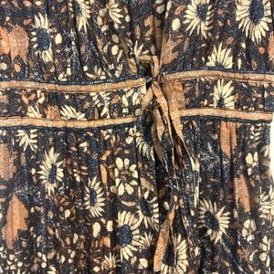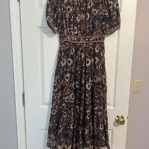 This dress fits like a size 4-6, and ties in the front. It is navy and floral Ulla Johnson from 2020 (ish). It is in very good condition!