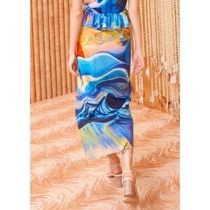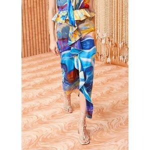 The Nora Skirt marks our first-ever collaboration with celebrated painter Shara Hughes, whose dreamy 2021 sunset painting “Tuck” is rendered across the silhouette in saturated blue and yellow hues. This limited-edition beauty is gathered at the waist with a cascading ruffle, has a front split, and falls to a column midi silhouette. It fastens with a concealed side zipper.