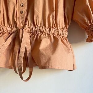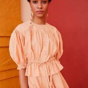 Peplum hem silhouette. Short, puff sleeves with an elastic cuff and a ruffled trim hem. Collarless, crew neckline. Relaxed bust. Gathering details throughout. Cinched in with an elastic waist and slim drawstring (for a custom fit). Front button down closure (placket). Unlined, no sheerness. Midweight, soft cotton poplin fabric with no stretch - except at elasticated cuffs and waist. 100% cotton. Machine wash cold (or hand wash/dry flat).