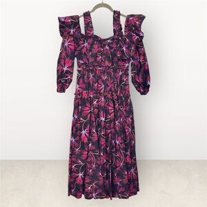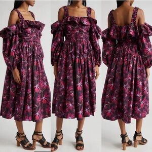 Vibrant floral print, chic cold-shoulder / off-shoulder silhouette, framed by voluminous long sleeves, ruffles at the bodice, bubble hemmed sleeves and ruffled neckline, wide ruched straps, and muti-arched seams along the midi-length skirt. Cut from brand’s signature printed poplin with magenta and hyacinth-hued blooms against a swirling background. Stunning ethereal vibe.