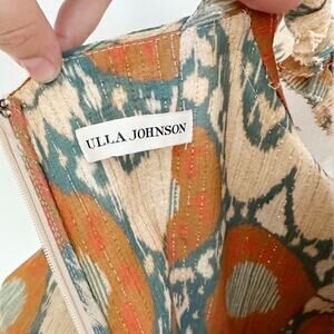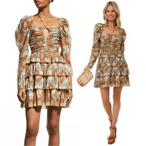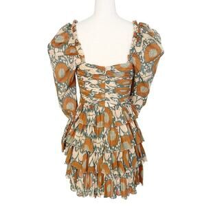 Keywords: Ulla Johnson mini dress, ikat metallic dress, boho ruffle dress, rust tiered dress, size 0 designer dress, garden party style, festival fashion, puff sleeve mini dress, earthy print boho dress, statement cocktail dress