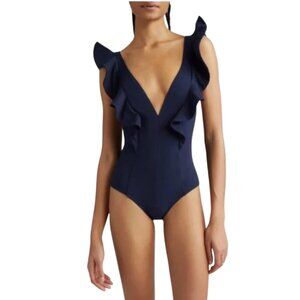Elegant navy one-piece swimsuit. Features ruffled details and deep V-neckline. Perfect for a stylish beach day.