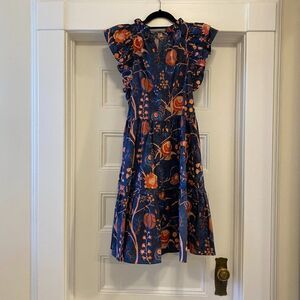 Elegant mini dress with ruffle details. Features a navy base with vibrant orange patterns. Perfect for a chic look.