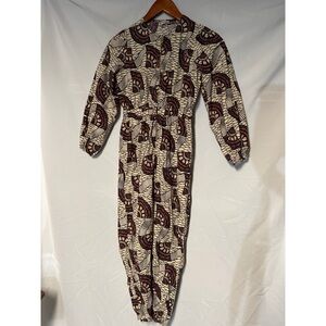 Stylish jumpsuit featuring a unique brown and cream pattern. Perfect for a bold fashion statement.pit to pit 16.5” inseam 23.5” length 45”